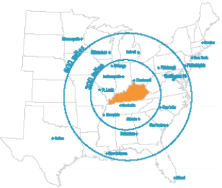 Nature and nurture have combined to make Kentucky a logistical paradise. Located at the center of a 34-state distribution area in the eastern United States, Kentucky’s location advantage facilitates the distribution of goods and materials to a massive industrial and consumer market. Kentucky’s borders are within a one-day’s truck drive or 600 miles of over 65 percent of the nation’s population, personal income, and manufacturing establishments.